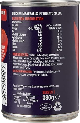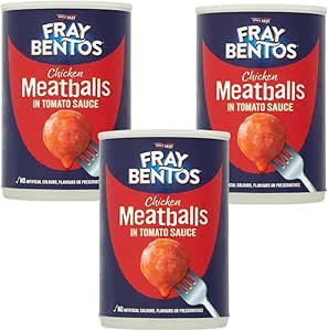 Discover Fray Bentos brand ofย Chicken Meatballs in Tomato Sauce, a delightful combination of succulent, bite-sized chicken meatballs swimming in a rich, flavourful tomato sauce. This convenient pack of three 380g tins offers excellent value and makes for a quick, satisfying meal solution. What sets these meatballs apart is their commitment to quality – they contain no artificial colours, flavours, or preservatives, ensuring you get pure, honest taste in every bite. The tender meatballs paired with the perfectly seasoned tomato sauce create a versatile dish that can be served over pasta, with rice, or even in sandwiches. Each tin provides a generous portion, making it ideal for family meals or batch cooking. Dating back to 1881, these tinned meatballs offer the perfect blend of convenience and traditional taste, ready to heat and serve whenever you need a wholesome meal.